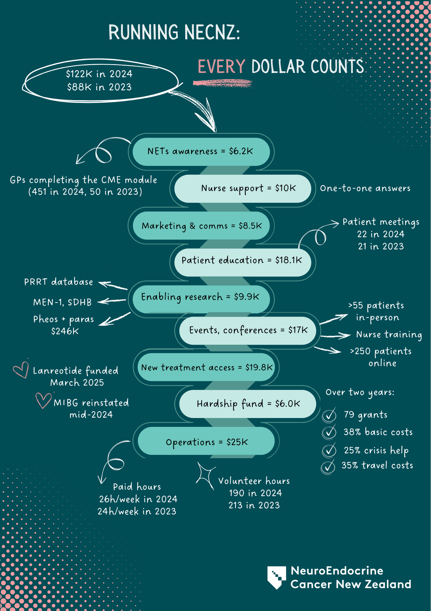 Neuroendocrine Cancer NZ relies heavily on community donations so fundraising for NCNZ means that you are directly helping our small team to continue raising awareness, continue advocating for our patients and work towards improving access to treatments, education, information and support.